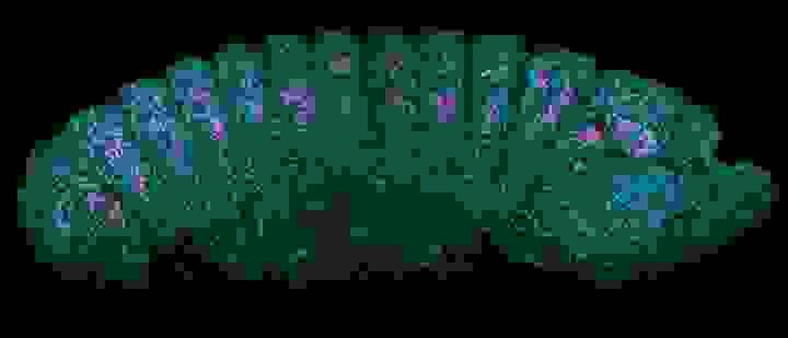Image was acquired using the confocal imaging modality of BC43, with 4 imaging channels, 77 stacks and 28 tiles. The full stitched image is composed of a total of 8624 images. The deconvolution and stitching options were both activated on the protocol. (image acquired ~ 30 min).