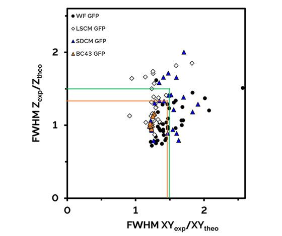 The graph on the right shows both lateral and axial resolutions of different types of fluorescent microscopes as a ratio of the theoretical full width half-maximum (FWHM).