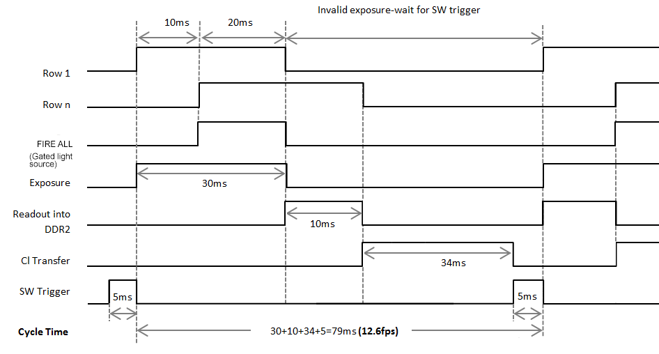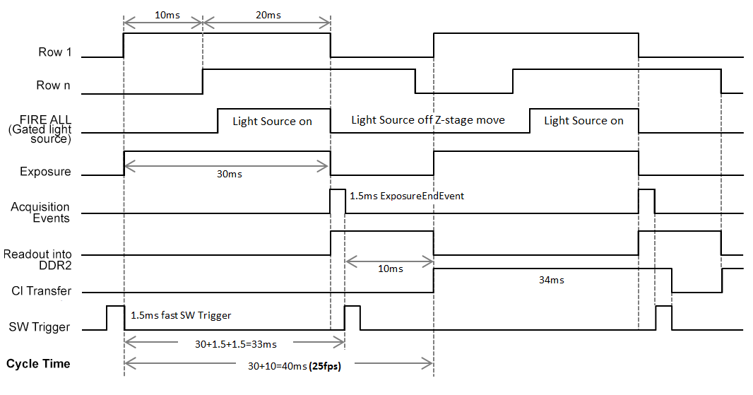 Compare the two diagrams below: The first diagram Rolling Shutter - Original Acquisition using SW Trigger. Example: 3-tap, RS, 560 MHz 30 ms exposure, full image. shows the situation prior to the introduction of the software events. In this case the user had to wait until the image frame was completely transferred to the PC before they received any notification that the exposure had completed. This results in a cycle time of approximately 79 ms or a frame rate of 12.6 fps, for this example. With acquisition software events (Rolling Shutter - New Acquisition using Events and Faster SW Trigger. Example: 3-tap, RS, 560 MHz 30 ms exposure, full image.)and in particular the ExposureEndEvent the user will be notified as soon as the exposure is complete in advance of readout completion. This in conjunction with faster SW trigger, means that the next acquisition can be started much sooner, resulting in an improvement in frame rate, 25 fps. In addition, the Fire ALL signal can be used to control light sources/z-stages.