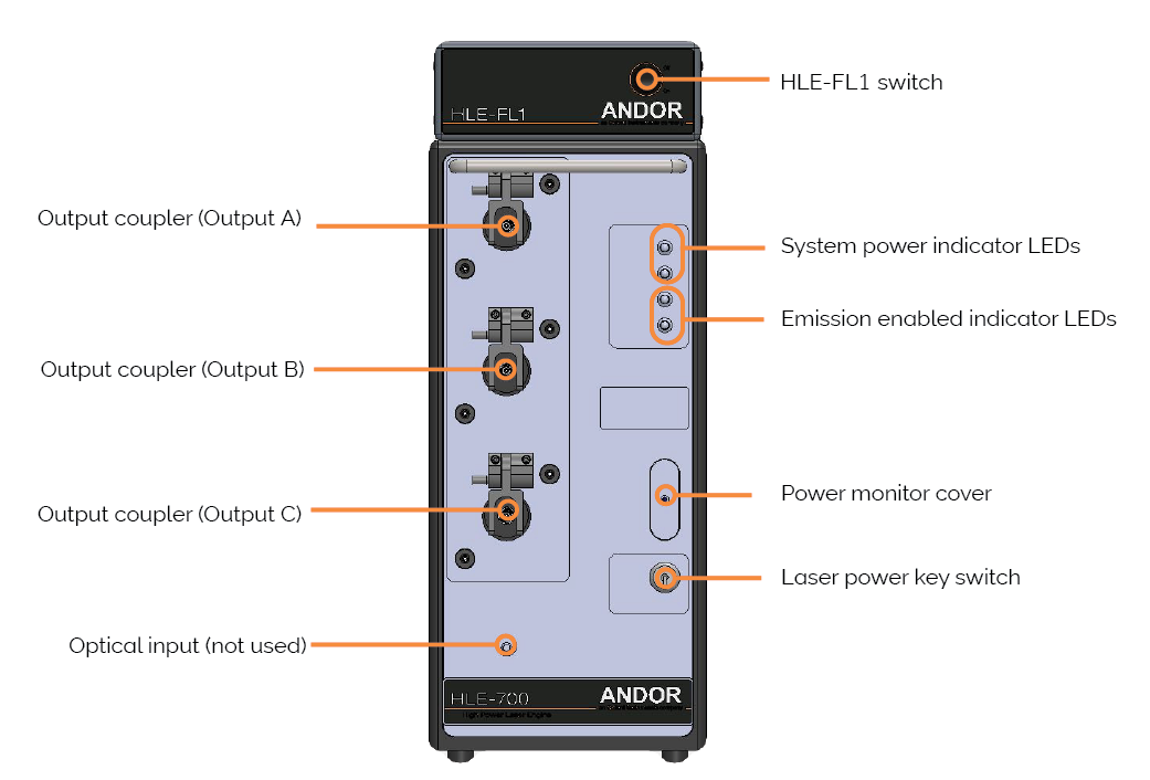 The Laser Power Key Switch does not turn off the temperature control of the lasers to allow them to remain stable, except for OBIS lasers (LM-HLE-561-150/ LM-HLE-594-100). Also, if the Laser Power Key Switch is in the OFF position the HLE primary shutter is closed, which blocks all laser emission from the HLE unit, which means that even if the HLE-FL1 laser is turned-on it cannot emit from the HLE unit.