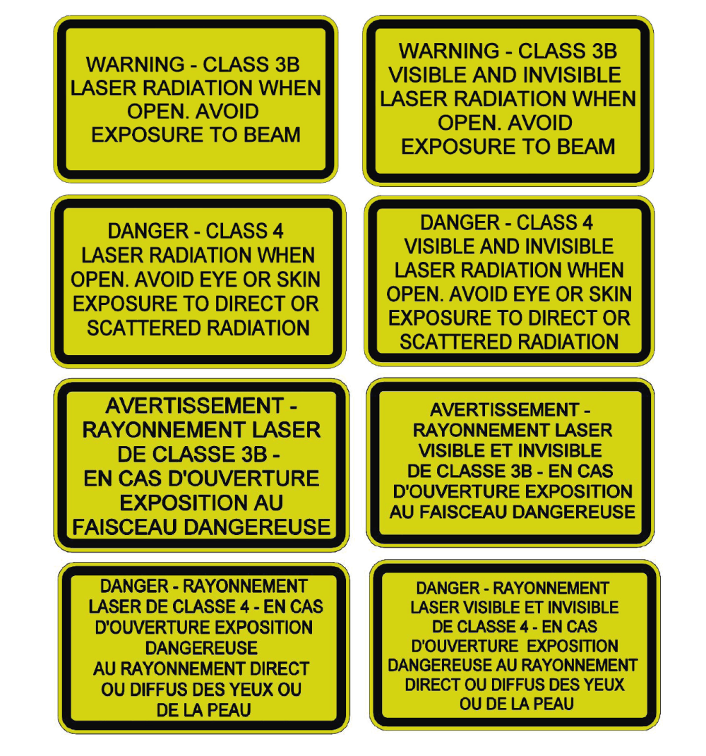 • Additional classification labels should be affixed to connected products that use laser radiation from this product. If these do not exist, then contact your occupational laser safety department and/or our customer support team to arrange for appropriate labels to be affixed.