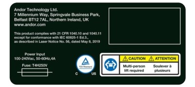 • The following label is located on each of the optical fibre output couplers on the unit and on the optical fibres provided with this product by Andor.