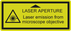 • The system integrator MUST ensure that the final system’s laser aperture is suitably labelled e.g. the microscope’s objective is identified by a label on the microscope’s stage top.