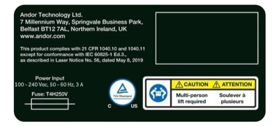 Andor laser aperture label for a microscope stage.