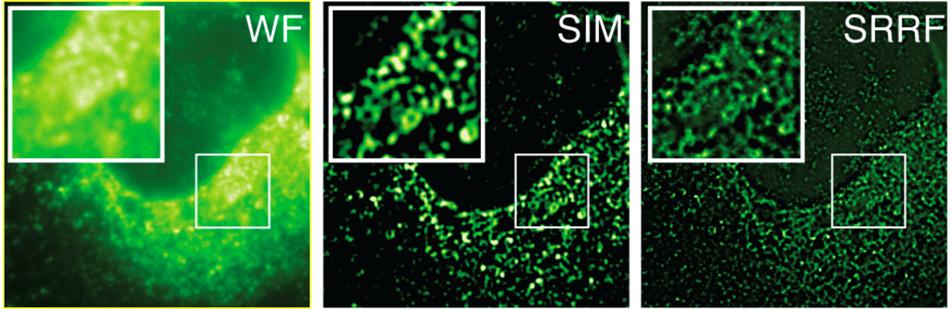 HCV infected cells stained with anti-NS5A. Here we are comparing Widefield (WF), Structured Illumination Microscopy (SIM) and SRRF images (SRRF of the widefield image). The images are of the same field of cells, recorded on the same microscope, using identical objective and optical path. The only difference being that SIM was recorded using an sCMOS detector with 6.5µm pixels whereas the Widefield and resultant SRRF was recorded using an iXon EMCCD detector with 16 µm pixels. The superior resolving power of SRRF is evident, indicative that SRRF is achieving a greater than 2-fold improvement over the classical diffraction limit. SIM is theoretically limited to a 2-fold reduction of the classical diffraction limit. Sample courtesy of the Grove lab at UCL.